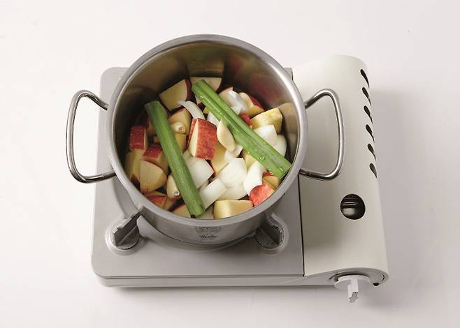 3. 냄비바닥에 사과, 양파, 마늘, 대파를 깔고 물(1/2컵)을 붓는다.