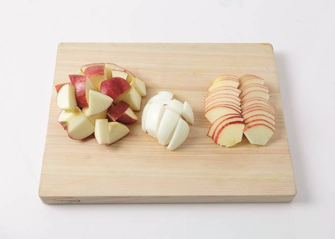 1. 사과(1개)와 양파는 큼직하게 깍둑 썰고, 나머지 사과(1개)는 4등분해 납작 썬다.