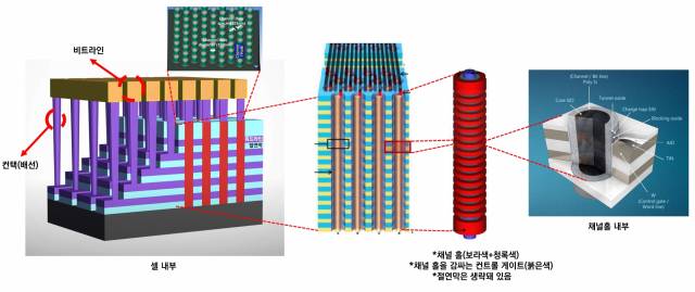 낸드 공정을 간략히 보면 이렇습니다. ①산화막(옥사이드)-질화막(나이트라이드)-산화막 수백 겹(ONO)을 쌓고요. ②이 막들을 관통하는 구멍을 뚫습니다. 이 구멍이 '채널홀'입니다. ③이 채널홀 속에 다양한 소재를 채워 넣어서 각 층마다 기억의 방을 만듭니다.