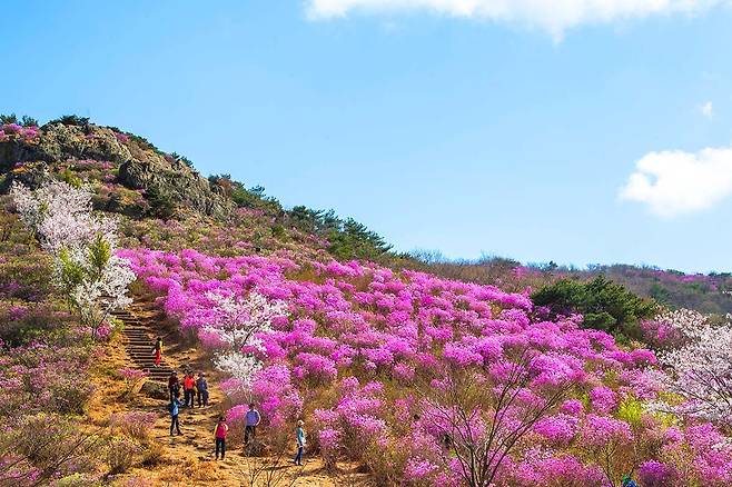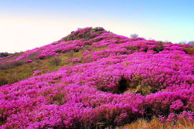 전라남도 여수에 위치한 영취산(靈鷲山, 510m)은 규모는 크지 않지만, 산세가 웅장하고 힘찬 느낌을 주는 곳입니다. 특히 봄이 되면 온 산이 진분홍빛으로 물드는 국내 최대 규모의 진달래 군락지가 형성되어 있어 많은 등산객이 찾습니다.