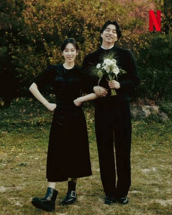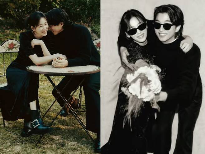 공개된 사진 속 공유와 서현진은 웨딩화보 콘셉트로 블랙 의상을 맞춰 입고 다정한 포즈를 취하고 있다. 부케를 들고 팔짱을 끼거나 머리를 살포시 기대는 등 다정한 모습이 눈길을 끈다.
