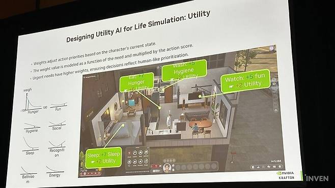 조 팀장은 스마트 조이 개발의 첫 번째 질문으로 “왜 언어 모델 기반 에이전트가 필요한가?”를 제시하며, 기존 접근법의 한계를 설명했다. 전통적인 캐릭터 행동 모델링은 주로 유틸리티 AI를 사용했다. 유틸리티 AI는 게임 상태에 따라 가능한 행동에 점수를 부여하고, 가장 높은 점수를 받은 행동을 선택하는 방식으로 작동한다. 예를 들어, 캐릭터의 필요(Needs) 상태를 숫자 스케일(-100에서 100)로 정의해 배고픔, 위생, 수면 등 8가지 필요를 관리하고, 각 행동이 이러한 필요에 미치는 영향을 점수화한다. 배고프면 먹는 행동의 점수가 높아지고, 이를 기반으로 행동이 선택된다.