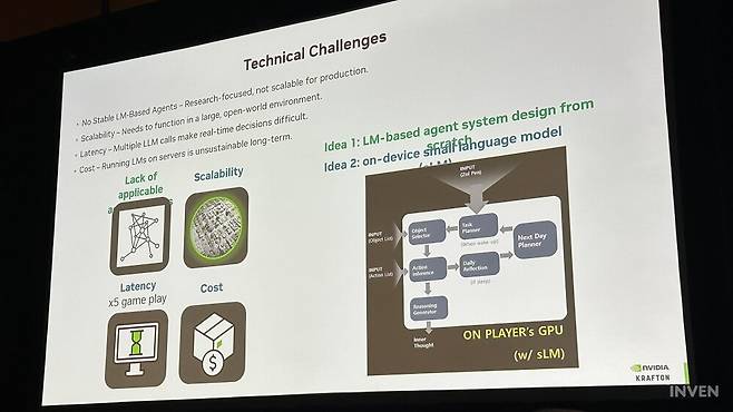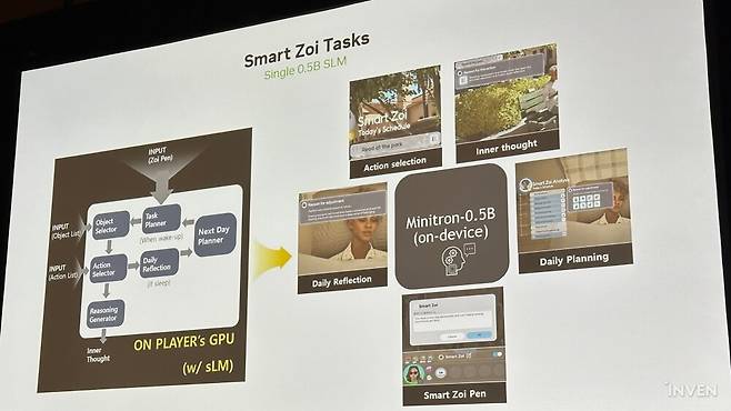 이를 해결하기 위해 크래프톤은 확장 가능하고 상용화에 적합한 새로운 에이전트 시스템을 처음부터 설계했다. 이어 서버 비용을 없애기 위해 소형 언어 모델을 사용자 디바이스에서 실행하도록 했다. 조 팀장은 “우리는 스마트 조이를 통해 캐릭터가 행동을 선택하고, 내면의 생각을 생성하며, 하루를 마무리하며 일기를 쓰고, 다음 날 계획을 세우는 모든 과정을 구현했다”고 강조했다.