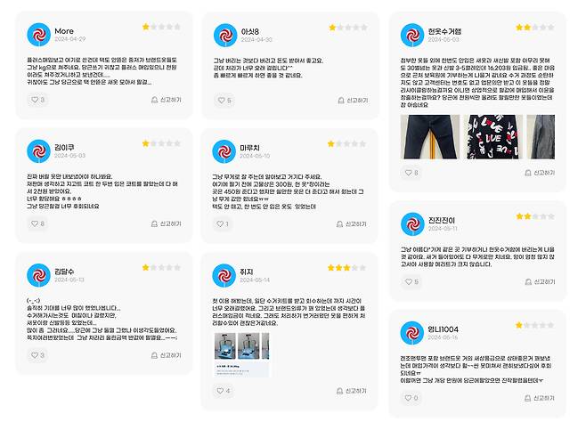 물론 이에 대한 고민으로 리클의 경우 헌 옷 수거 경험에 대한 리뷰를 마련해두기도 했어요. 그러나 리뷰에 대한 관리가 이루어지지 않고 있다 보니 최저점의 리뷰들이 상단에 배치되면서 오히려 서비스 신뢰를 갉아먹는 아쉬움을 보여주고 있어요.