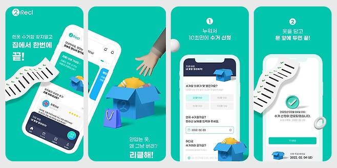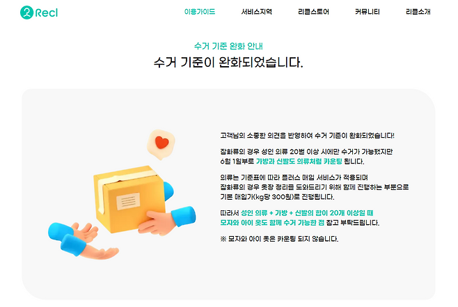 실제로 서비스가 어떻게 이루어지는지 앱을 깔고 들어가 봤어요. 헌 옷을 수거와 택배 두 가지 방식으로 수거하고 있었어요. 리클의 담당자가 직접 수거할 수 있는 지역은 수거를 요청하고, 지방이나 그 외 지역에 사는 사람은 택배 서비스를 이용해 리클의 가이드에 맞게 제품을 보낼 수 있었어요.