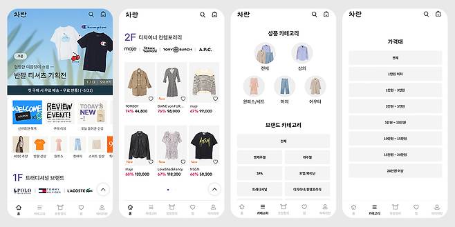 차란 앱에 들어가 보면 리클과 다른 브랜드 아이덴티티가 뚜렷하게 드러나요. 초기 홈 화면부터 ‘백화점’처럼 꾸며져 있는데요. 이들은 카테고리를 중심으로 제품을 진열해 두었어요. 1층, 2층, 3층 식으로 층을 나누어 트래디셔널 브랜드, 디자이너 컨템포레리 식으로 진열을 기획했죠.