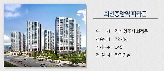 라인그룹은 경기 양주시 회정동 회천지구에 짓는 '회천중앙역 파라곤'을 분양합니다. 수도권전철 1호선 회천중앙역(예정)을 도보 5분거리에 둔 역세권이며 GTX-C노선 기점역인 덕정역도 가까워 서울 등 도심으로 이동이 한층 수월해 집니다. 양주회천 도시첨단산업단지, 양주테크노밸리 등이 조성 중에 있어 배후 단지로도 관심을 끕니다.