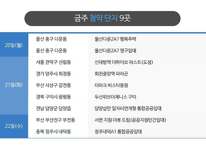 권역별로는 수도권 2곳, 지방 7곳 등이며 지하철이나 공원, 체육시설 등의 인프라를 갖춘 단지들이 눈에 띕니다.