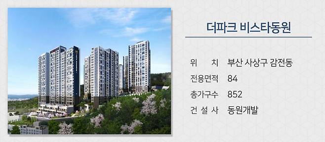 동원개발이 부산 사상구 감전동에 짓는 '더파크 비스타동원'을 분양합니다. 축구장 약 90개 규모의 사상공원 내에 들어서는 민간공원 특계사업 아파트라 주거환경이 쾌적합니다. 공원 안에는 숲체험교육관을 비롯해 산책로 등 다양한 휴식공간이 마련돼 입주민들은 편리하게 이용할 수 있습니다. 부산지하철 2호선 감전역, 사상역 등을 이용할 수 있으며 사상드림스마트시티 개발로 직주근접 입지도 갖추고 있습니다.