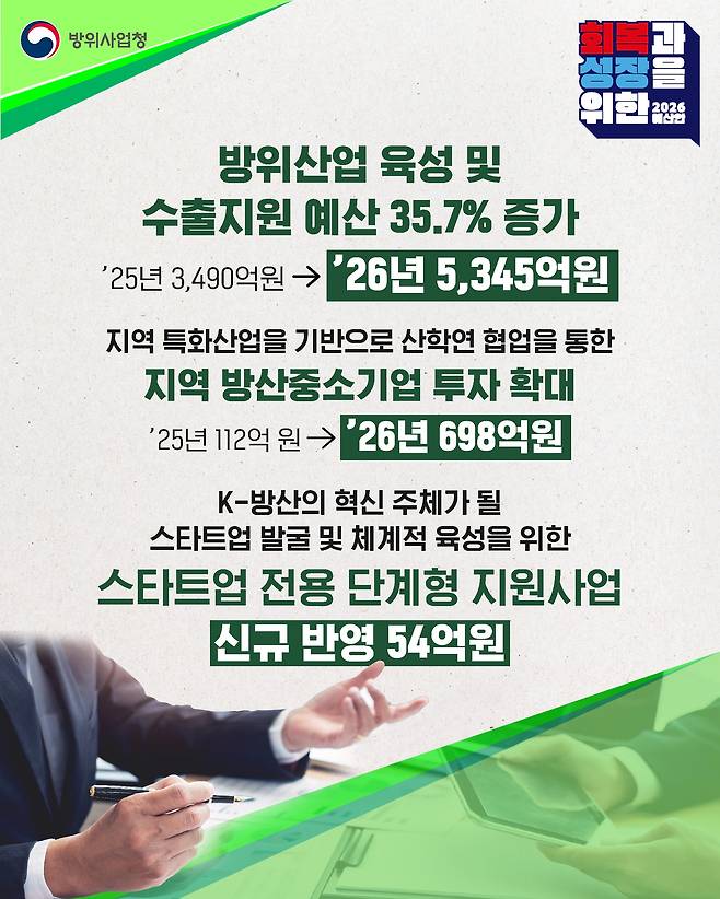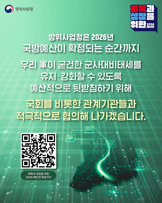 방위사업청은 2026년 국방예산이 확정되는 순간까지 우리 軍이 굳건한 군사대비태세를 유지·강화할 수 있도록 예산적으로 뒷받침하기 위해 국회를 비롯한 관계기관들과 적극적으로 협의해 나가겠습니다.