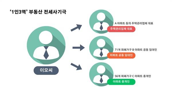 | ▲ 미추홀구 전세사기 구조 2023년 1월 18일 자 <아시아경제> [전세사기 실태추적]⑨인천 미추홀구 ‘나홀로아파트’ 건축왕의 사기극 기사 재구성 |