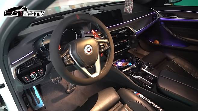 실내도 들여다보면 순간 M5가 있어요. 기어봉 보고 딱 알았는데, 고성능 느낌이 확 나가지고 헷갈리네요. 빨간색 패들시프트는 기본 세팅이잖아요. 국룰 튜닝이죠.