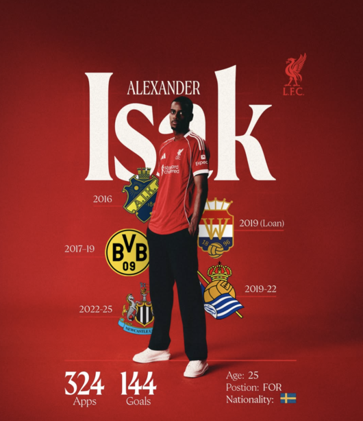 리버풀 합류 소감을 전한 이삭은 “리버풀 선수가 된 게 자랑스럽다. 팬들과 동료들을 빨리 만나고 싶다”라며 “난 단순한 스트라이커가 아니다. 득점뿐 아니라 팀 전체를 돕는 데 집중하겠다. 모든 대회에서 우승하는 것이 목표”라며 각오를 다졌다.