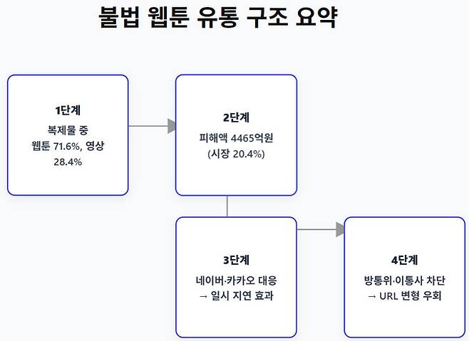 한국콘텐츠진흥원이 지난해 발간한 웹툰산업 실태조사를 참고하면 지난 2023년 기준 불법 웹툰에서 비롯된 피해액은 4465억원으로 추산된다. 당시 웹툰시장 규모가 2조1890억원이었다는 점을 고려하면 20.4%에 달하는 금액이다. 지난해에는 피해액이 5000억원을 훌쩍 넘겼을 것으로 상정된다.