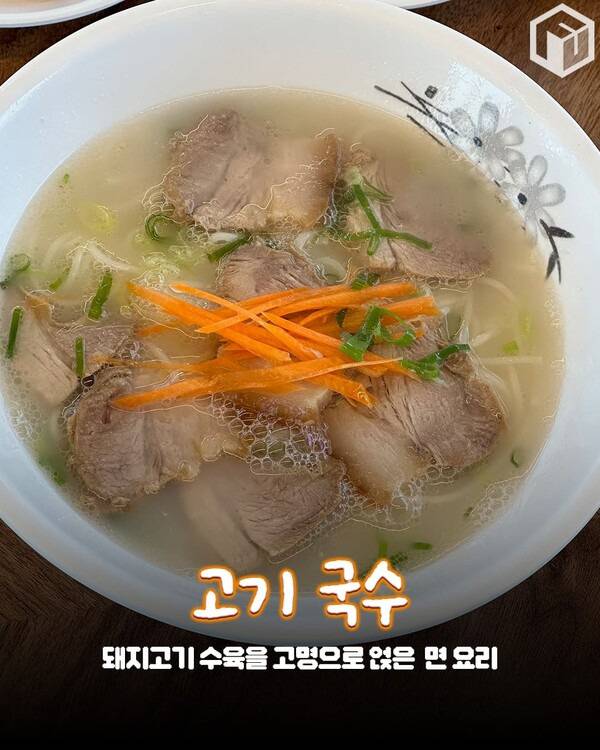 고기국수는 담백한 육수에 얇은 국수를 말고 돼지고기 수육을 올린 제주도의 대표적인 소울푸드입니다.