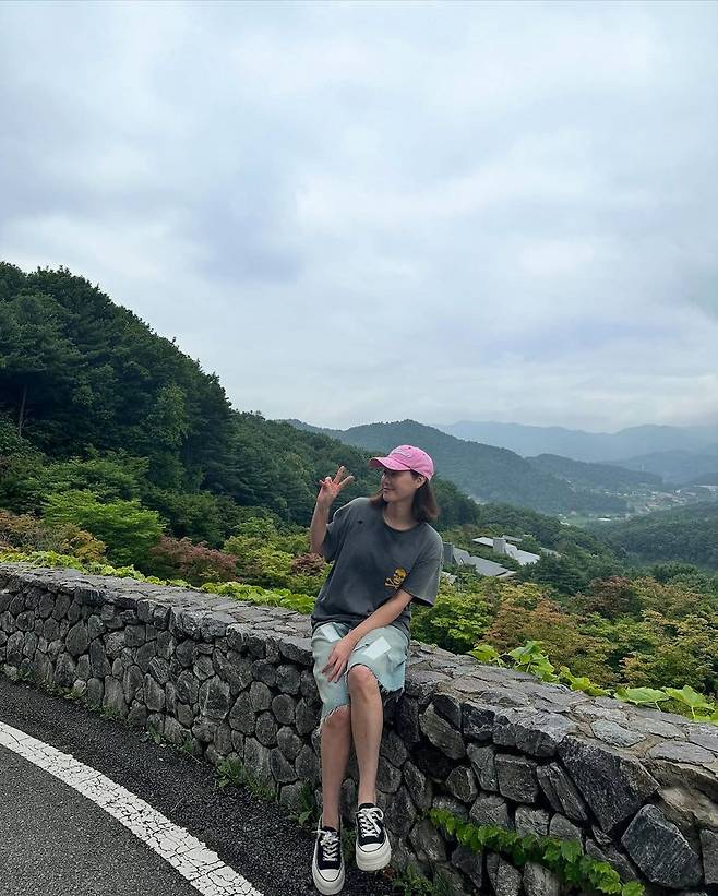 김성령의 룩은 여유로운 핏의 워싱 데님 버뮤다 팬츠와 다크 그레이 프린팅 티셔츠 조합으로 시작된다. 넉넉한 길이감의 하의는 활동성과 스타일을 동시에 만족시키며, 상의의 프린트가 룩에 생기를 더한다. 여기에 핑크 컬러의 볼캡을 포인트로 매치해 전체적인 톤에 유쾌함을 더했고, 발에는 블랙 앤 화이트 클래식 스니커즈로 편안함을 유지했다.