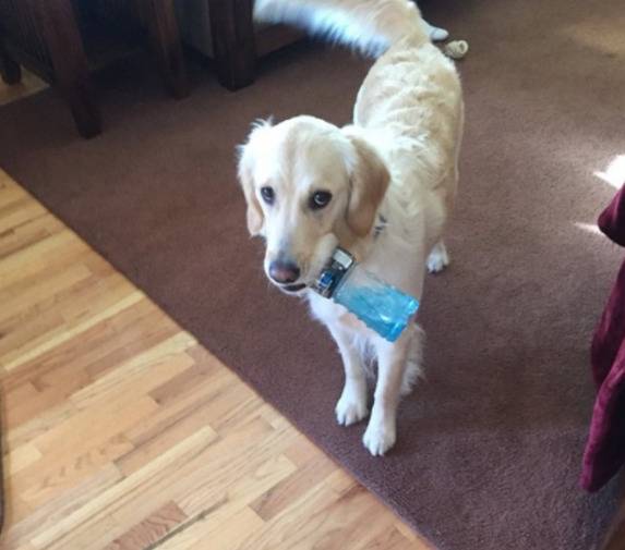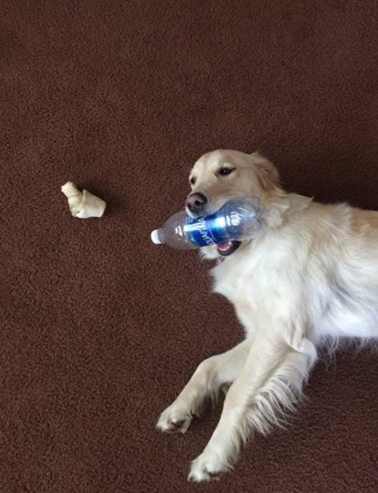 텔레비전을 보고 있던 트래비스 씨에게 스텔라가 파워에이드 한 병을 물고 다가왔습니다.