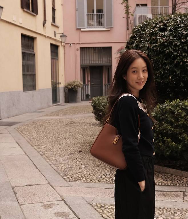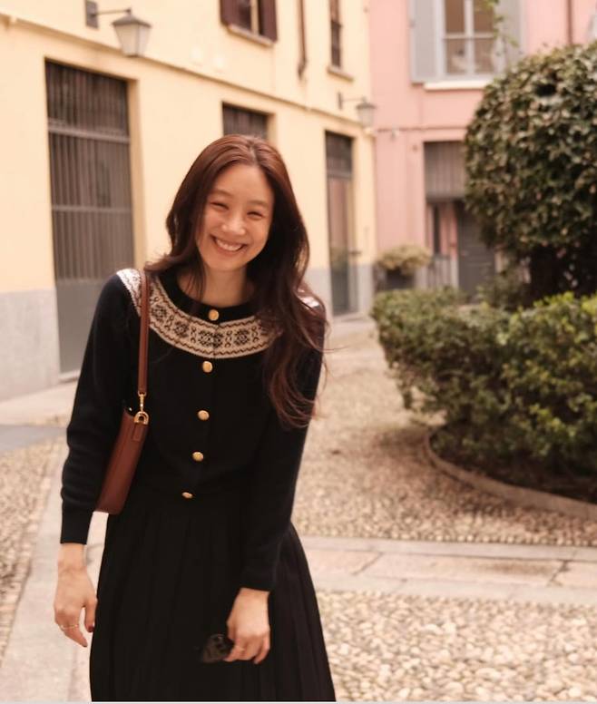정려원은 화려한 금장 버튼이 돋보이는 네이비 톤 니트에, 클래식한 플리츠 롱 스커트를 매치해 차분하면서도 고급스러운 분위기를 연출했습니다.