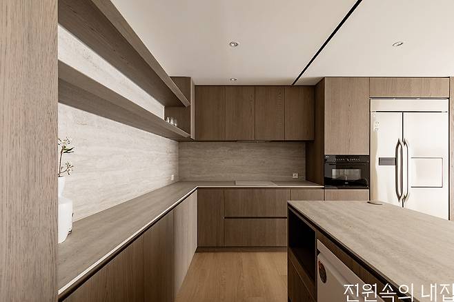 2. 제작 원목 선반주방 전면의 답답함을 없애기 위해 상부장 대신 제작 원목 선반을 설치했다. 가로 결이 살아있는 트래버틴 세라믹을 함께 시공해 가로로 더 길어보인다.