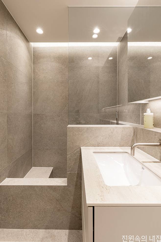 요리를 좋아하는 건축주는 주방 구조에 관심이 많았다. 이전의 주방은 동선이 너무 길어서 아일랜드를 새롭게 설치한 후 대면형 주방을 완성했다. 주방 옆 세탁실이 있던 공간은 김치냉장고 등을 두어 보조 주방으로 사용하고 있는데, 메인 주방과 연결되도록 인테리어를 일치시켜 주었다. 시선을 사로잡는 벽면 세라믹 타일은 차분하게 정리된 주방에 고급스러움을 더해준다.이제 입주한 지 한 달 남짓, 가족은 아침마다 테라스 정원에서 차를 마시고 가끔 브런치를 함께 하며 새로운 집에 자연스럽게 적응해 가고 있다. 태어난 지 얼마 되지 않은 손주와 큰딸의 가족 역시 이 집에서 잠시 지내며 안락하고 따스한 공간에 깊이 만족하고 있다. 자연을 품고, 자연을 닮은 집은 시간이 갈수록 따뜻함과 깊이감을 더해가는 곳이 될 것이다.
