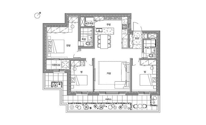 오랜 시간이 지나도 변함없이 편안하고 자연스러운 집을 만드는 것은 생각보다 쉬운 작업이 아니다. 가족의 라이프스타일과 성향을 세심하게 고려해 공간에 녹여내야 하고, 시공은 눈에 거스르는 것 없이 깔끔하고 디테일하게 마무리되어야 한다. 10년 넘게 주택에서 살았던 건축주 권재향 씨는 도심으로 이사하며 아파트에 살게 되었다. 권재향 씨가 바랐던 집은 가족 모두가 편안하게 쉴 수 있는 공간, 결혼한 큰딸의 가족이 방문했을 때도 각자의 공간을 확보하며 안락하게 지낼 수 있는 공간이었다. 건축주가 지금의 집을 고민 없이 선택하게 된 이유 중 하나는 바로 테라스다. 이곳에 가족만의 작은 정원을 가꾸고 특별한 시간을 보내기를 원했다.