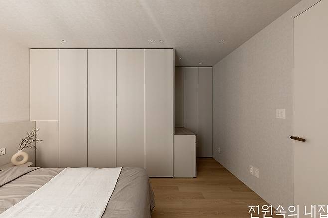 “과감한 시공법을 통한 기교 있는 디자인보다는, 바탕에 무엇을 두어도 조화를 이루는 내추럴한 공간으로 방향성을 설정했습니다.” 리노디자인스페이스의 송준호 대표는 무엇보다 자연스러운 공간을 만드는 것에 집중했다. 우선 집의 포인트라고 할 수 있는 테라스의 자연을 내부로 온전히 들이고자 했고, 자연과 조화롭게 어울릴 수 있도록 자연을 닮은 자재를 선택했다. 원목에 가까운 강마루, 미색의 친환경 도장, 브론즈 컬러의 손잡이 등은 각자의 자리에서 은은하게 빛나며 서로 어우러지는 모습을 보여준다. 또한 군더더기 없는 라인을 구현하기 위해 고도의 목공 작업이 선행되었다. 리모델링 전 천장에는 200mm가 넘는 흡음 및 단열재가 시공되어 있었는데, 일반적인 절차대로 천장 목공사를 진행할 경우 몇 년 후에 처짐 현상이 발생할 수 있다고 판단했다. 송 대표는 이를 방지하기 위해 천장 전체 앵커 작업을 진행했다고 전했다.