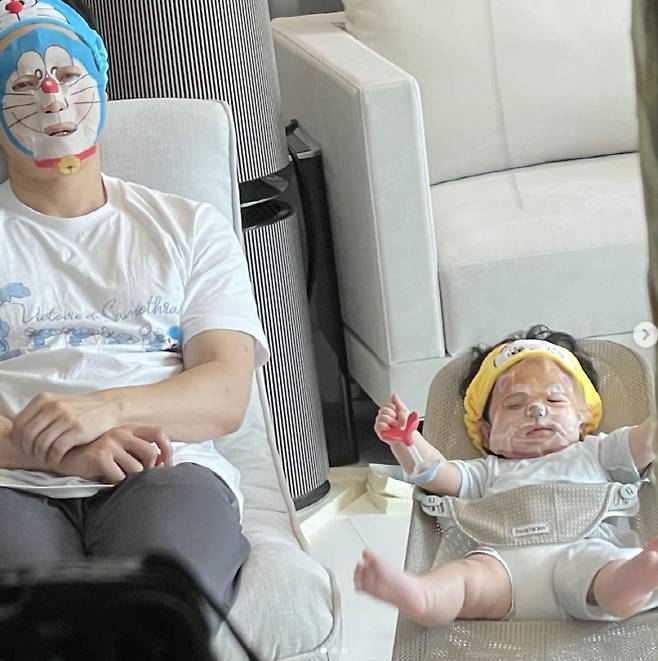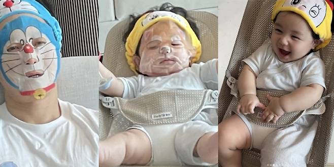 공개된 사진 속 심형탁은 도라에몽 캐릭터 마스크팩을 착용한 채 아들과 나란히 앉아 있어 시선을 강탈했다.