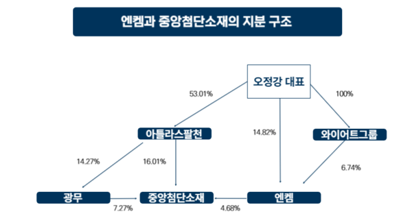 양사는 모두 오정강 엔켐 대표이사가 사실상의 최대주주로 자리한 회사라는 점에서 공통점이 있다. 오정강 대표는 53.01% 지분을 보유한 회사 아틀라스팔천을 통해 중앙첨단소재의 경영권 지분(16.01%)를 보유하고 있다. 엔켐의 경영권 지분(14.82%)은 직접 보유하고 있으며, 지분 100%를 보유한 와이어트그룹을 통해 6.74%의 추가 지분도 소유하고 있다.