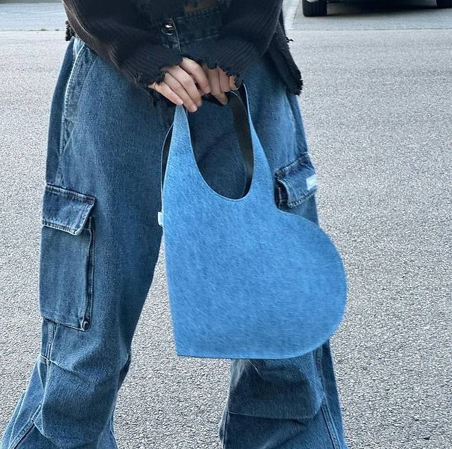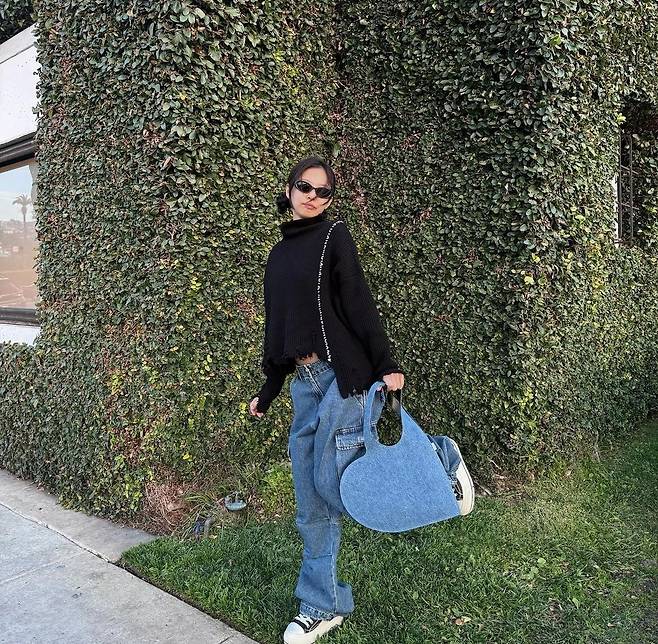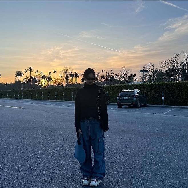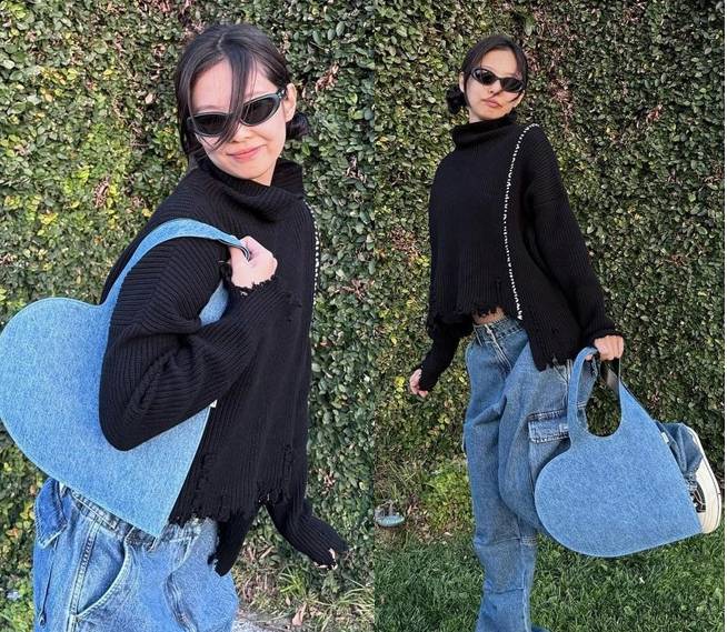 제니는 크롭 블랙 터틀넥 스웨터에 넉넉한 핏의 카고 데님 청바지를 입고 빅 사이즈 블루 하트 모양의 핸드백을 매치해 전체적인 룩에 활기를 불어넣으며 선글라스를 쓰고 자신만의 스타일을 멋지게 표현했습니다.