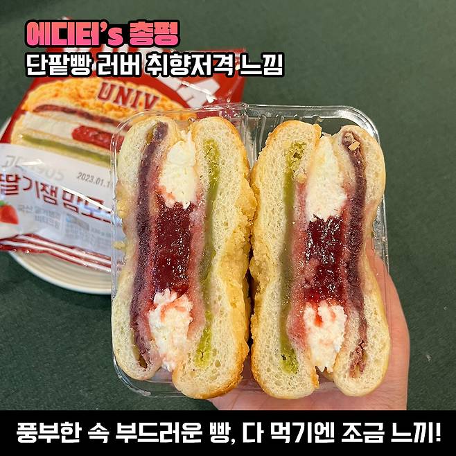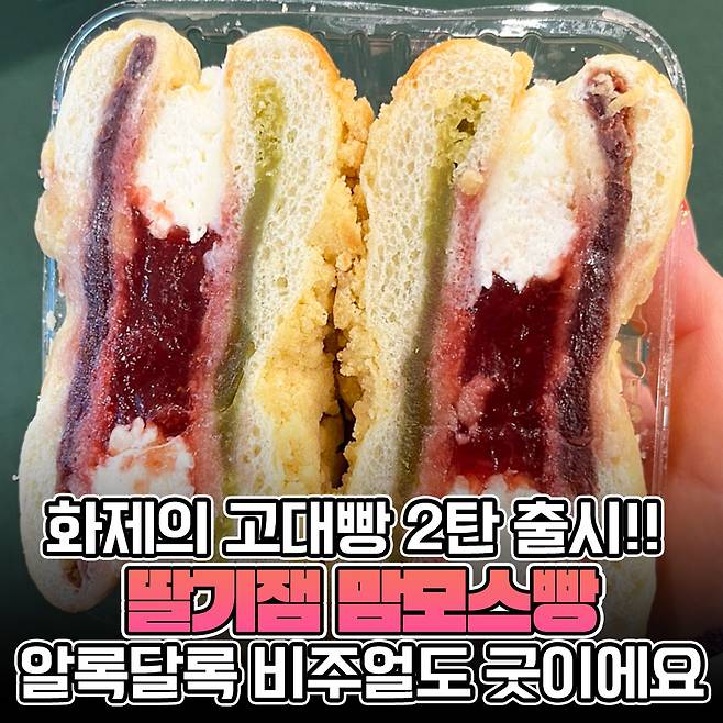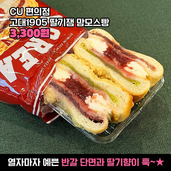 이 기세를 이어 고대도 지지 않고 고대빵을 출시하고 있어 눈길을 끌고 있죠? 지난달 출시된 1탄 사과잼 페스츄리에 이어서 더 풍성해진 속을 자랑하는 고대빵 2탄을 등장했지 뭐예요. 바로 밥심언니가 오늘 소개할 ‘고대1905 딸기잼 맘모스빵’이에요!!
