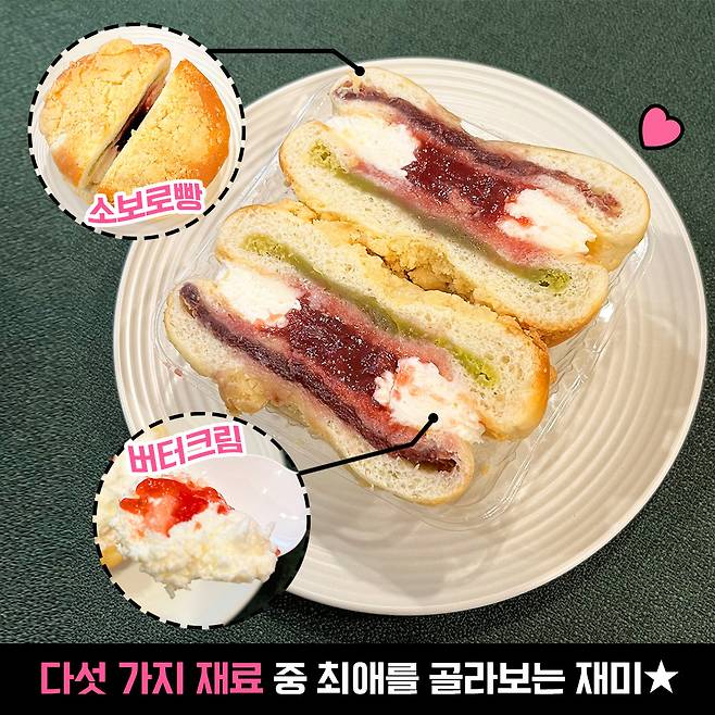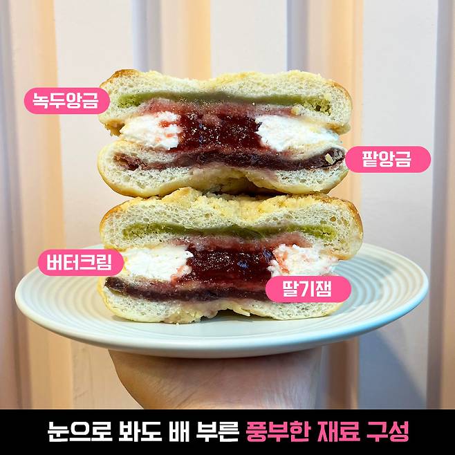 단팥, 완두, 딸기잼, 버터크림으로 되어있지만 버터크림이랑 딸기가 다 한 느낌?! 버터크림이 부드러워서 더 좋았습니다~ 다만 한 개를 다 먹으면 너무 달 것 같아요..★ 당충전하고 싶으면 또 먹을래요!