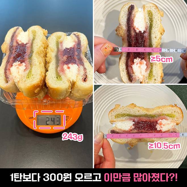 중량은 243g 가량으로 나왔는데, 포장지에 적힌 230g보다 월등히 많은 양이었어요. 게다가 1탄 페스츄리보다는 무려 70g 정도 더 무거운 편! 300원의 기적이 이 정도여도 괜찮은 거 맞죠…?!