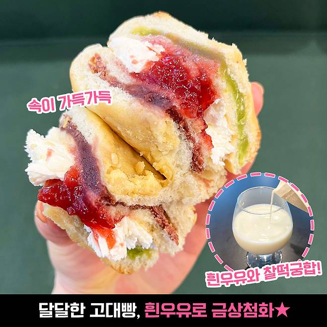 반갈샷 색 구성만 봐도 얼마나 다양한 재료가 들어있는지 예상 되시나요? 고대 맘모스빵은 저온에서 24시간 숙성 시킨 반죽으로 구워낸 빵에 소보로를 토핑으로 올리고, 100% 국내산 딸기로 만든 딸기잼과 고소하고 부드러운 버터크림, 팥앙금과 녹두앙금으로 속을 꽉 채웠답니다.