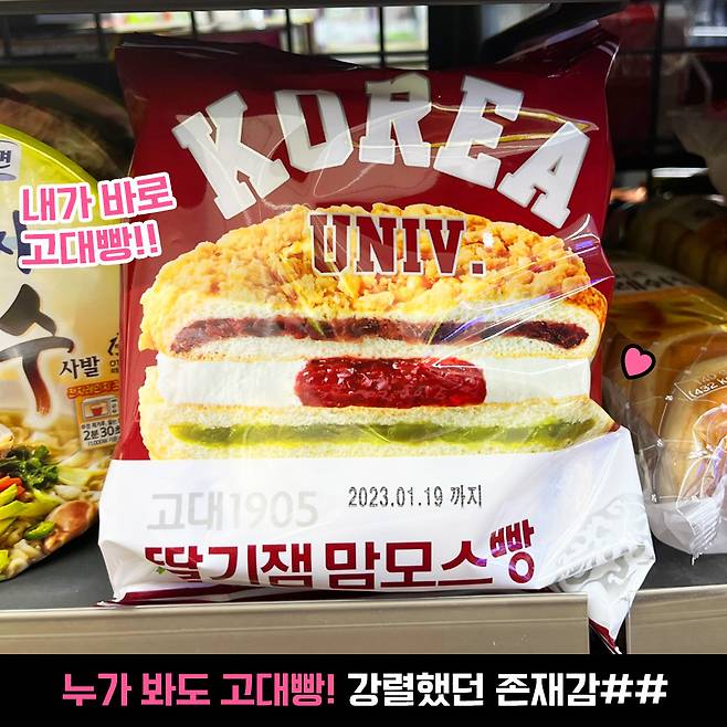 이 기세를 이어 고대도 지지 않고 고대빵을 출시하고 있어 눈길을 끌고 있죠? 지난달 출시된 1탄 사과잼 페스츄리에 이어서 더 풍성해진 속을 자랑하는 고대빵 2탄을 등장했지 뭐예요. 바로 밥심언니가 오늘 소개할 ‘고대1905 딸기잼 맘모스빵’이에요!!