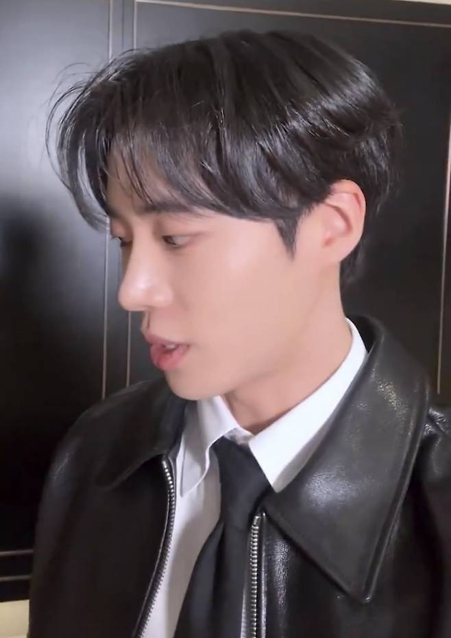 레더 재킷, 화이트 셔츠, 블랙 타이,