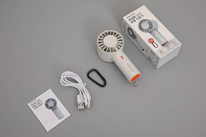 구성품으로는 모노큐브 휴대용 미니 써큘 선풍기 본체와 카라비너, 충전용 케이블, 그리고 사용 설명서가 기본 제공된다.