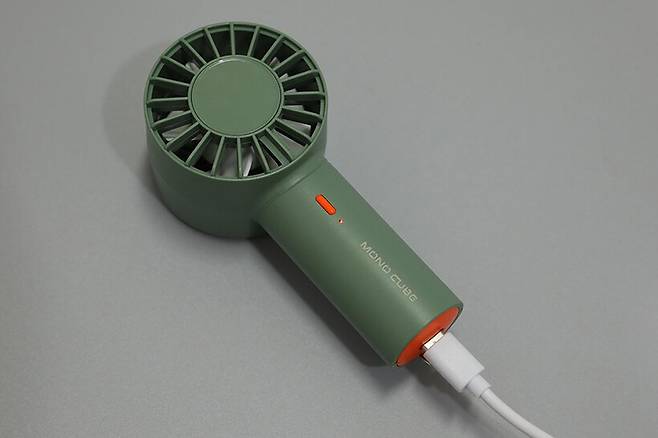 모노큐브 휴대용 미니 써큘 선풍기의 헤드 부분은 직경이 작으면서 깊이가 깊어 초소형 서큘레이터의 느낌이다. 헤드 안쪽에는 5엽 날개가 보이며, 수명이 길고 효율이 높은 BLDC 모터를 사용하고 있다.