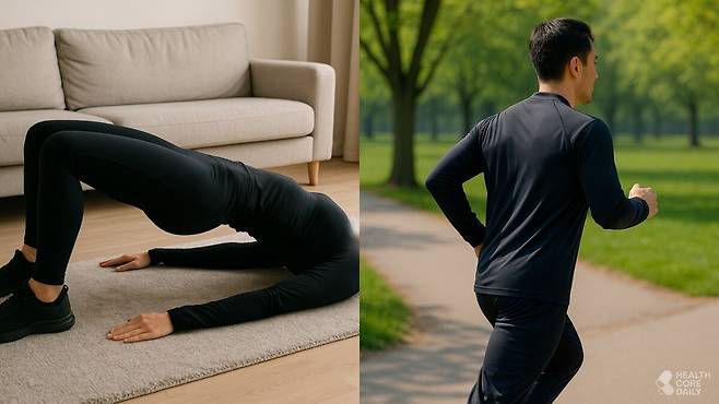 브릿지는 집에서도 간단하게 할 수 있는 대표적인 근력 운동으로, 특히 등과 둔근을 비롯해 골반과 허리, 하체 전체를 단련하는 데 효과적이다.