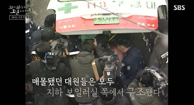 구조 작업이 시작된 지 얼마 안돼 대원 한명이 발견됐어. 콘크리트 사이로 얼굴이 보였어. 현관 쪽에서 방수 작업을 하고 있던 김철홍 대원이야. 그런데 의식이 없어. 돌덩이들을 얼른 치워야 해. 하지만 몇 명이 달라붙어도 꿈쩍을 안해. 구조대원이 바닥에 엎드려 최대한 안쪽으로 팔을 뻗어 철홍 대원의 얼굴에 쓰여진 마스크부터 벗겼어. 당시에 공기통 사용 시간은 25분이었어. 만약 공기가 바닥난 상태에서 계속 이 마스크를 쓰고 있다간 오히려 질식해서 사망할 수 있는 거야. 손가락 끝으로 간신히 마스크를 벗겨 냈어. 그 순간, 철홍 대원의 입에서 하얀 입김이 나왔어. '살았구나' 싶었어. 서둘러 해머로 콘크리트를 깨기 시작했어. 그렇게 한참 구조작업에 매달린 끝에 드디어 김철홍 대원을 꺼내는데 성공했어. 그 시각이 새벽 5시, 매몰된 지 50분 만이었어.