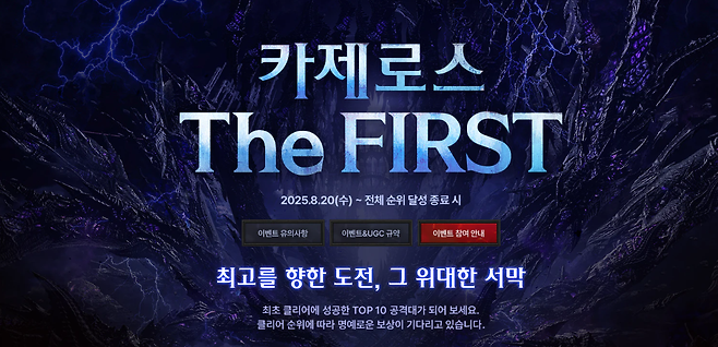 더 퍼스트 공략 구조 1️⃣카제로스 4막 하드 난이도 클리어 2️⃣종막의 더 퍼스트 난이도 레이스 개시 3️⃣종막의 클리어 성공 시 차주 노말, 하드 난이도 개방 4️⃣퍼스트 클리어 이후 순서에 따라 2~10위 랭크인 5️⃣레이스 종료 후 타임어택 콘텐츠 추가 개방 로스트아크 1부의 최종 보스 '카제로스'를 향한 도전이 시작됐다. 이른바 카제로스 더 퍼스트. 카제로스 더 퍼스트 이벤트는 카제로스 레이드 '종막 : 최후의 날'의 The FIRST 난이도를 최초 클리어 한 10개의 공격대를 기념하는 이벤트다. 지난 카멘 더 퍼스트와 비슷한 형태의 이벤트로 레이스에 참가를 원하는 공격대는 먼저 하드 난이도 4막을 클리어하고, 종막의 더 퍼스트 난이도에 도전, 최초 클리어 10인 안에 들면 된다. 더 퍼스트 10인까지는 공식 홈페이지 명예의 전당 등록, 카제로스 더 퍼스트 칭호, 카제로스 트로피, 모험가 배너를 받을 수 있으며 1위에게는 더 퍼스트 공격대 기념비(귀환석 석상), 심연의 군주 카제로스 스태츄 보상이 추가된다. 2~3위는 특별 칭호와 특수 배너를 주기에 2~3위 입성도 큰 명예다. 현재까지 퍼스트 클리어 기록을 독주하고 있는 공격대는 방송인이자 프로게이머 출신인 캡틴잭, 후니가 있는 '로아사랑단'이다. 이들은 카멘 더 퍼스트를 달성한 것에 이어 카제로스 1막, 2막, 3막을 모두 퍼스트 클리어에 성공했다. 이에 맞서는 로네다(포셔, 노돌리, 봉킹)나 로코코(빈세로이) 등 초호화 스펙을 자랑하는 공격대가 로사단의 연승 행진을 막을 수 있을지 주목된다. 한편, 카제로스 더 퍼스트는 지난 카멘 더 퍼스트의 사례를 교훈 삼아 다양한 방지책을 세웠다. 종막은 더 퍼스트로만 도전할 수 있기 때문에 노말로 진도를 빠르게 빼거나 하드에서 기믹을 미리 학습할 수 없다. 또 득템으로 스펙이 갈리는 아크 그리드 또한 더 퍼스트 한정으로 적용되지 않는다. 공격대를 교체하더라도 클리어 시점에서 기록이 저장되며, 모든 공격대 구성원은 계정 내 더 퍼스트 이벤트 클리어 기록이 없어야 한다. 즉 원정대나 부계정을 이용해 중복 클리어가 불가능하다. 부정 프로그램 사용, 버그 악용, 대리게임 위탁 등은 모두 금지이며, 여타 부적절한 행위가 발견될 경우, 게임사가 게임 이용 제한 등의 조치를 할 수 있다. 더 퍼스트 기록 달성자라면 기록 무효 처리, 이벤트 보상 회수, 게임 이용 영구 정지 등의 불이익이 있을 수 있다.