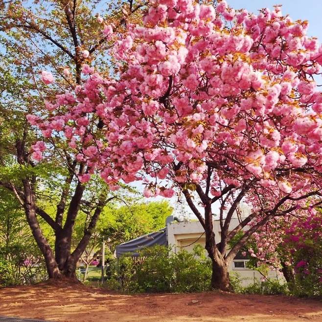 겹벚꽃 주변으로 초록빛의 싱그러운 나무와 잔디 등 조경이 있어 봄내음을 한껏 만끽하기에도 좋습니다.