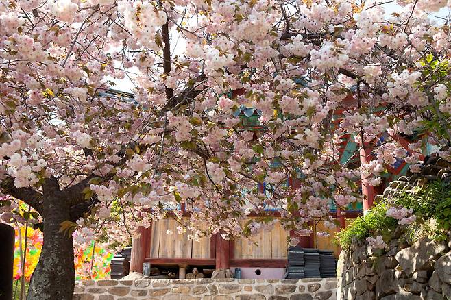 개심사 내 안양루 마루에 앉아 여유로운 사찰의 풍경을 만끽해도 좋은데요. 해탈문을 들어가기 직전 오른편을 바라보면 하늘을 가릴 정도로 풍성하게 만개한 겹벚꽃의 모습이 장관입니다.