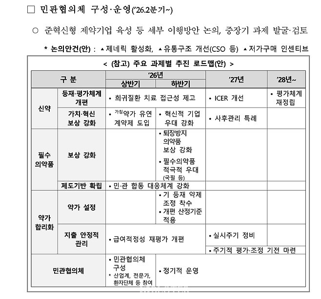 신약과 필수의약품 지원책도 함께 담았다. 희귀질환 치료제의 건강보험 등재 기간은 올해부터 현행 최대 240일에서 100일 이내로 단축한다. 약가 유연계약제 적용 대상은 올 2분기부터 ▲신규 등재 신약 ▲특허만료 오리지널 ▲바이오시밀러 등으로 넓힌다. 퇴장방지의약품 지정기준과 원가보전 기준도 손질한다.