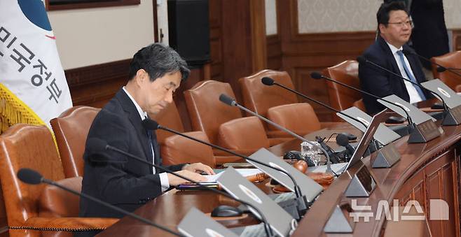 [서울=뉴시스] 고범준 기자 = 이주호 대통령 권한대행 부총리 겸 교육부 장관이 2일 서울 종로구 정부서울청사에서 열린 임시 국무회의에 참석해 자료를 살펴보고 있다. (대통령실통신사진기자단) 2025.05.02. bjko@newsis.com