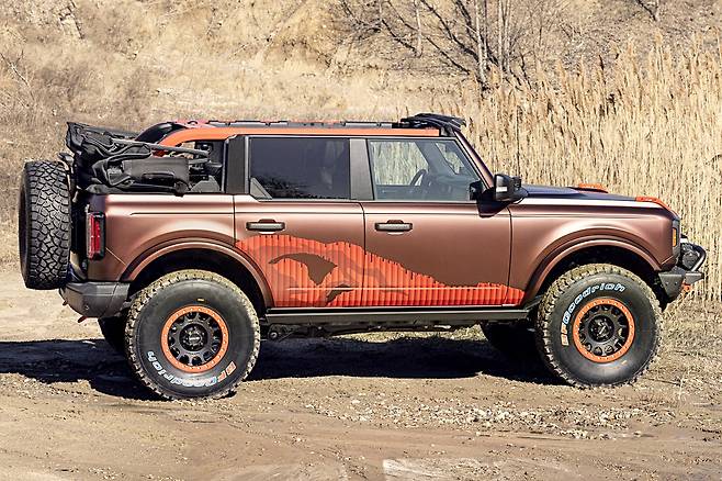 브롱코 아치스 에디션은 모아브의 붉은 바위 지형에서 영감을 받아, 동급 차량에서는 보기 드문 마감 색상과 패턴을 채택했다. 오렌지와 브라운이 조화를 이루는 외관은 단순한 튜닝을 넘어서, 시각적으로 자연과의 연결성을 강조한다. 전용 로고와 스페셜 페인팅은 콘셉트카 이상의 품격을 지닌다.