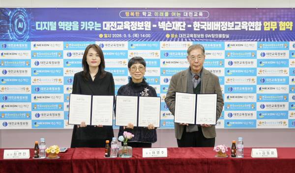 넥슨재단과 한국비버정보교육연합은 대전광역시교육청 산하 대전교육정보원과 무료 코딩 교육 통합 플랫폼 'BIKO(비코)'를 기반 컴퓨팅 사고력 및 정보교육 역량 강화를 위한 3자 업무협약(MOU)을 체결했다고 6일 밝혔다.