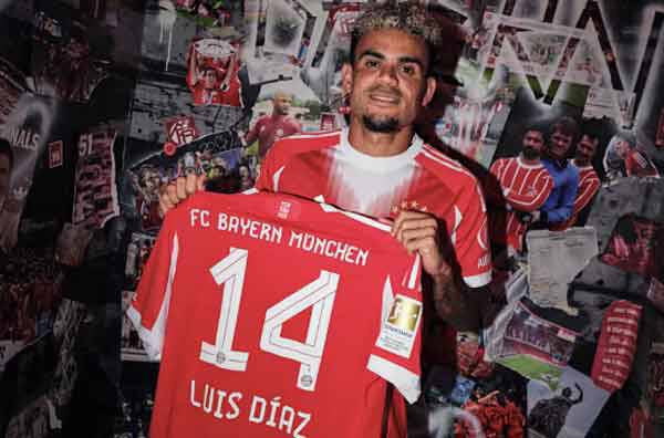 리버풀을 떠나 바이에른뮌헨에 새 둥지를 튼 콜롬비아 출신 윙어 루이스 디아즈는 비어있는 등번호 14번을 택했다. 뮌헨이 30일 공식채널을 통해 14번 유니폼을 들어올린 디아즈의 사진을 공개했다. 디아즈는 7500만유로(약 1210억원)의 이적료에 뮌헨과 4년 계약을 체결했다. 리버풀에선 7번을 달았다.