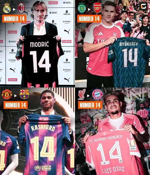 레알마드리드에서 '월클 커리어'를 쌓은 크로아티아 전설 루카 모드리치는 자유계약으로 AC밀란으로 이적하면서 14번을 골랐다. 프로 경력 초창기에 크로아티아 대표팀과 토트넘에서 달았던 번호를 다시 달았다. 모드리치가 남긴 레알의 10번 유니폼은 킬리안 음바페에게 돌아갔다.