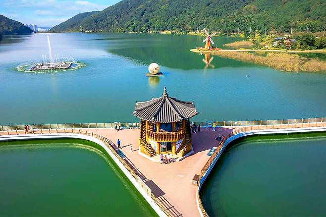 풍차와 바람개비 쉼터가 어우러진 경관은 마치 유럽의 한 시골 마을을 걷는 듯한 착각을 불러일으킨다. 호수를 가로지르는 백년수중다리는 이 공원의 백미다.