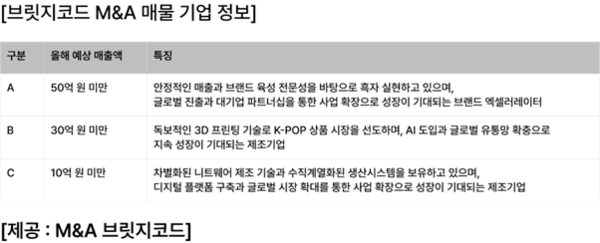 매각을 주관하는 브릿지코드의 김대업 파트너는 "A사는 검증된 브랜드 육성 역량과 안정적인 재무구조와 함께 글로벌 확장 가능성까지 갖춘 기업”이라며 “뷰티·라이프스타일 분야에서 새로운 성장을 모색하는 기업들에게 매력적인 인수 대상이 될 것"이라고 말했다.